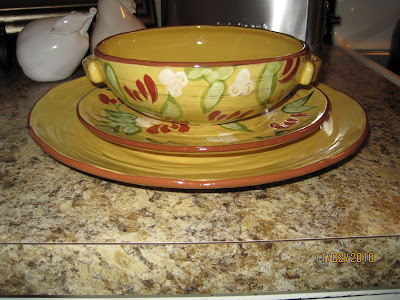 A new family tradition began when our son moved away from home after his college graduation. We divided the holidays. Even numbered years, our son has Thanksgiving at his house, odd numbered years we host Thanksgiving On Crooked Creek. Shortly after arriving to our new home, "Mr. Ed" and I discussed the need for some new dishware. Having raised two very active sons (and their host of friends) life had taken it's toll on our set. (Notice that is a singular term?)